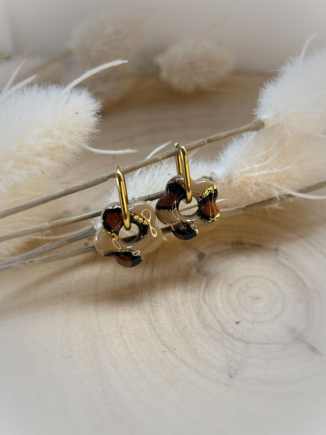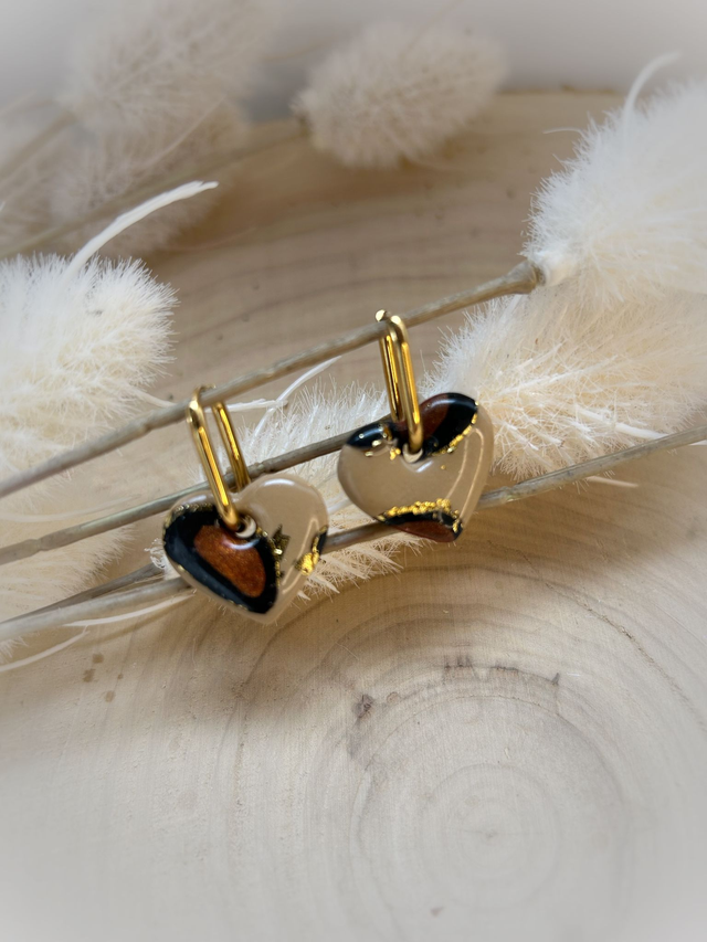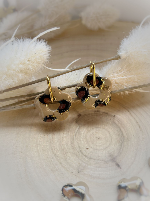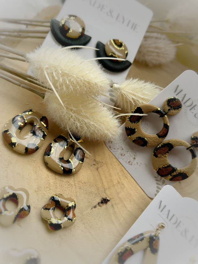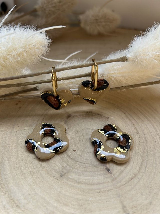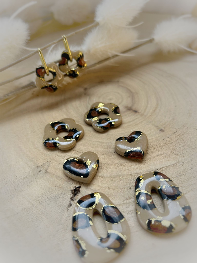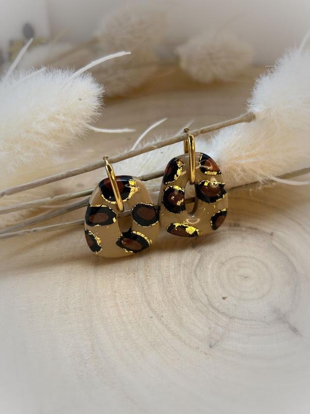 Modelées à la main en pâte polymère, elles dévoilent un motif léopard aux reflets dorés, symbole d’audace et de féminité solaire.