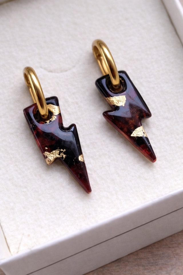 Affichez une allure audacieuse avec ces pampilles en forme d’éclair, symbole d’énergie et d’esprit rebelle. Façonnées à la main, elles dévoilent un effet tortoise profond sublimé par de délicats éclats de feuilles d’or, pour un contraste captivant entre intensité rock et éclat glamour.